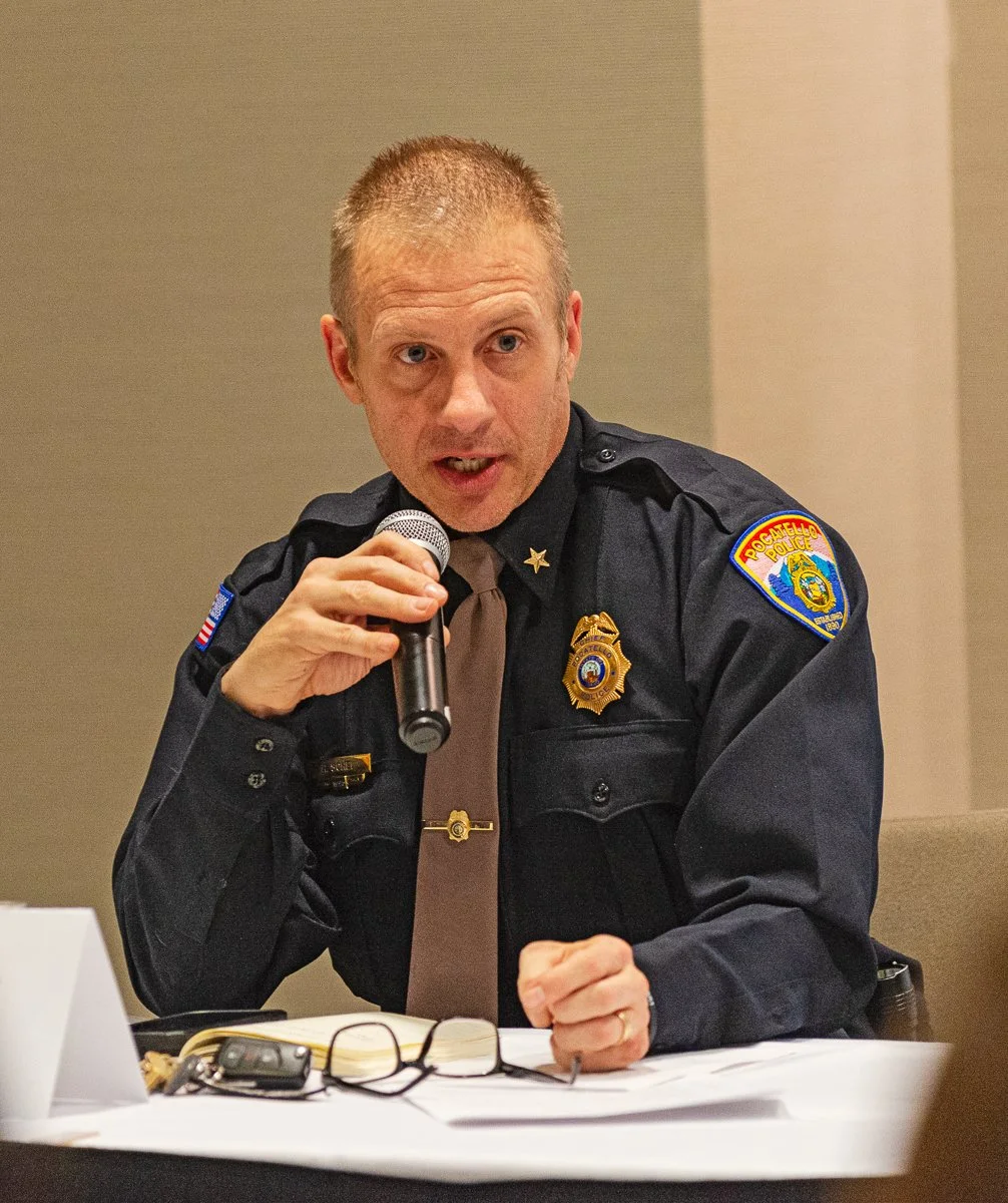 Pocatello Police Chief Roger Schei speaks February 20 at the Prepare Now meeting at ISU